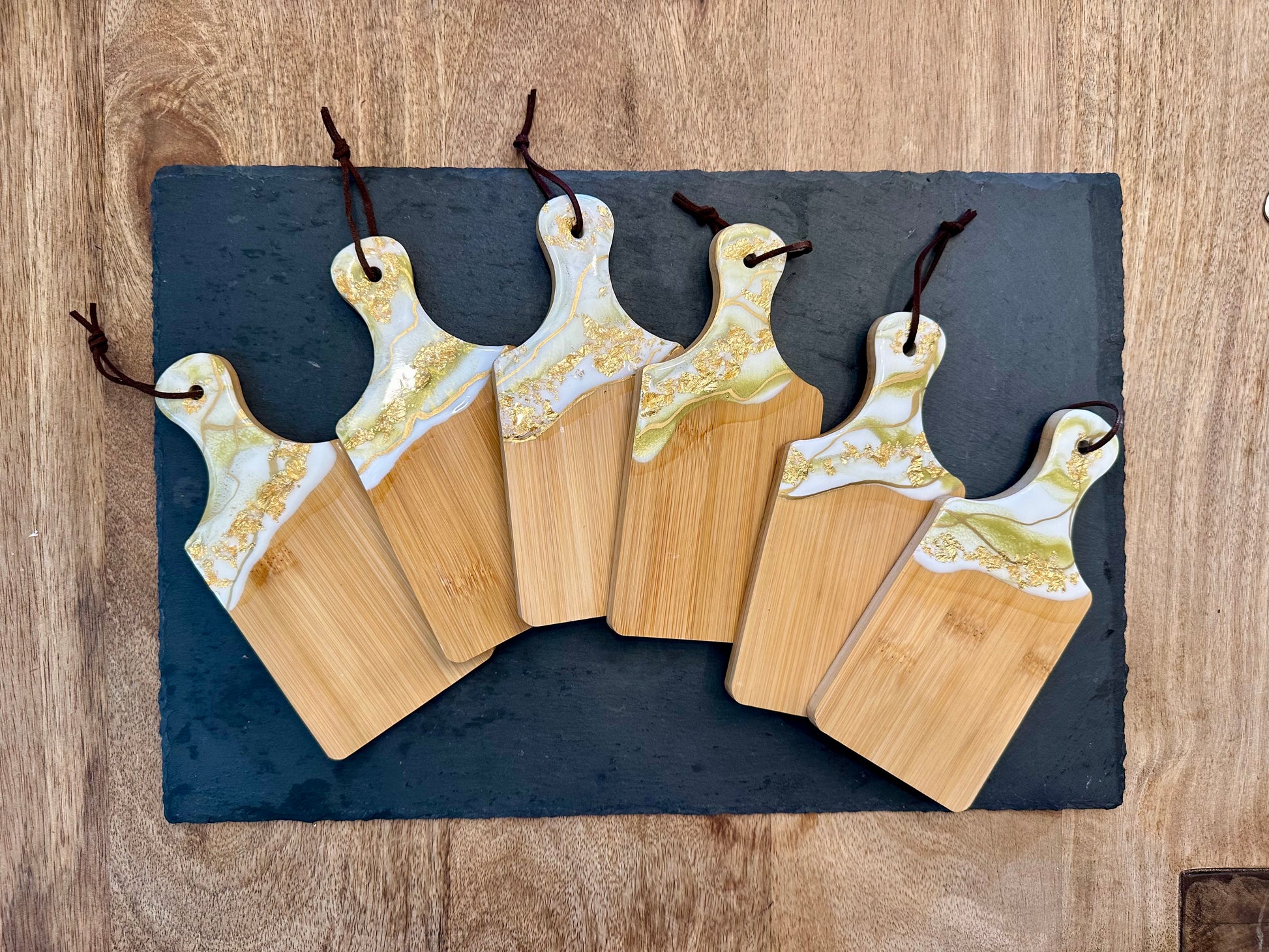 Material and colors: Golden pistachio swipe, with gold foil encased in resin on bamboo board, with faux suede lanyard.