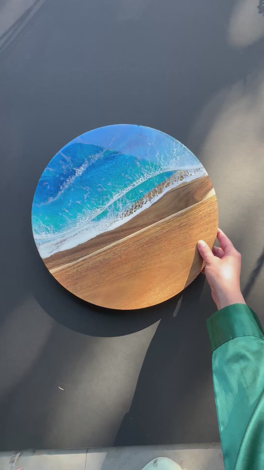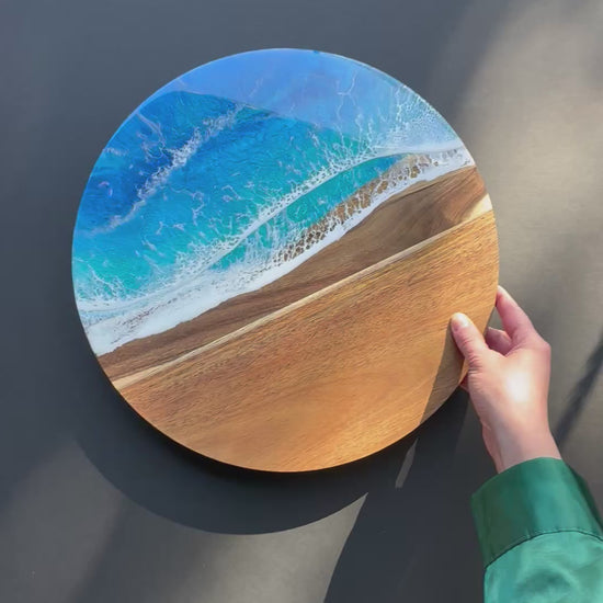 Elevate your dining and entertaining experience with our Lazy Susan. This stunning piece features an acacia wood base and ocean design using food-safe epoxy resin. The ocean waves add a touch of coastal style and versatility, making it a statement centerpiece for any tabletop.