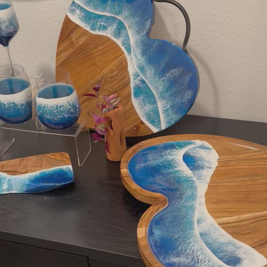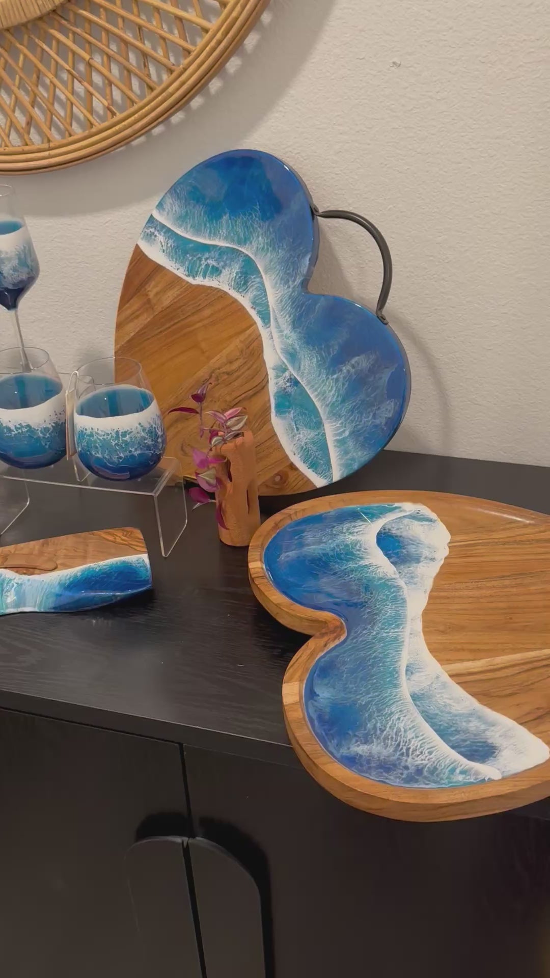 - Resin Design: The ocean waves design adds a coastal flair to the natural wood base.