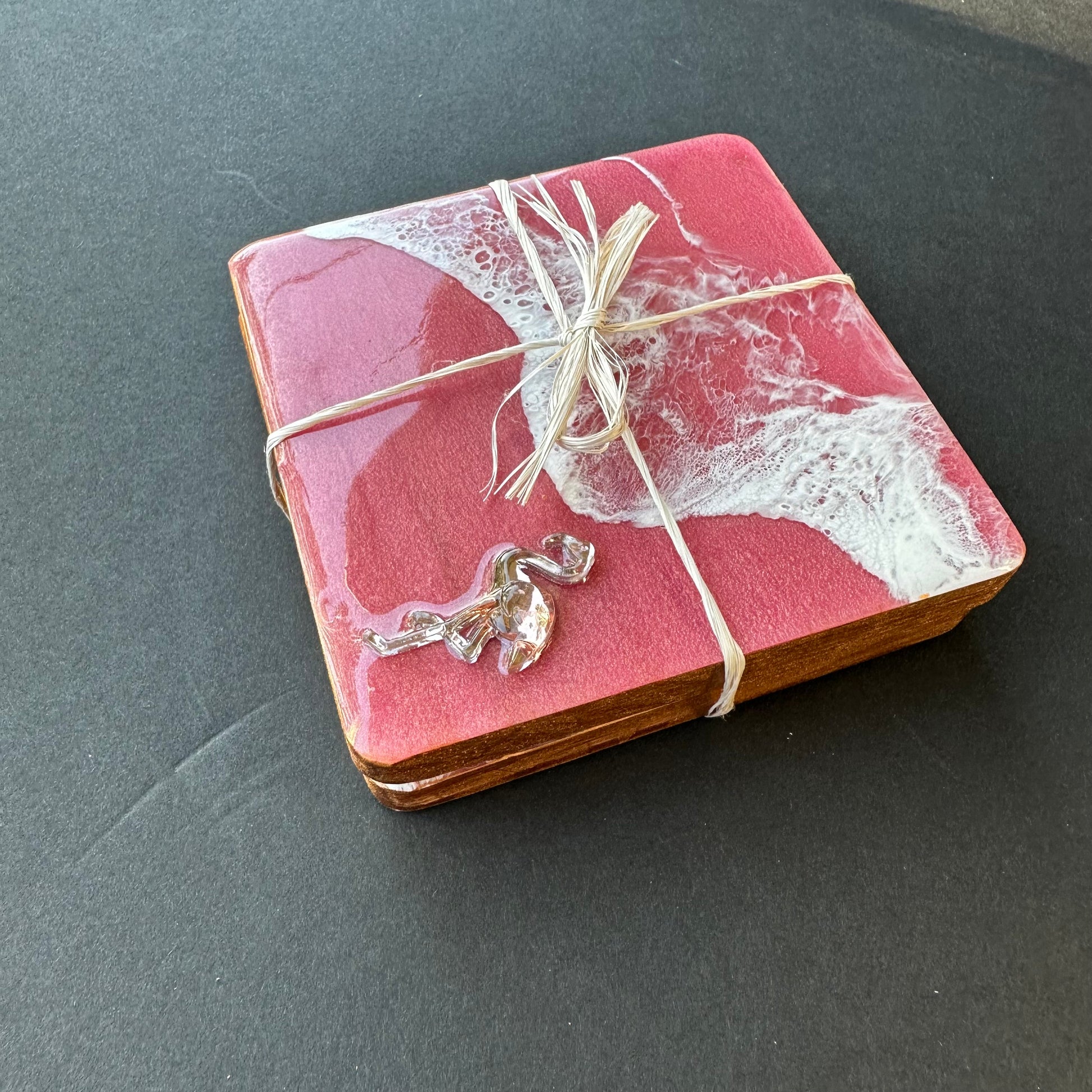 Add a coastal touch to your decor with our Handmade Coaster Sets. Made from light weight wood and decorated with stunning pink ocean wave designs using premium epoxy resin, these coasters bring elegance and functionality to any space. Each piece is thoughtfully crafted to showcase unique waves.